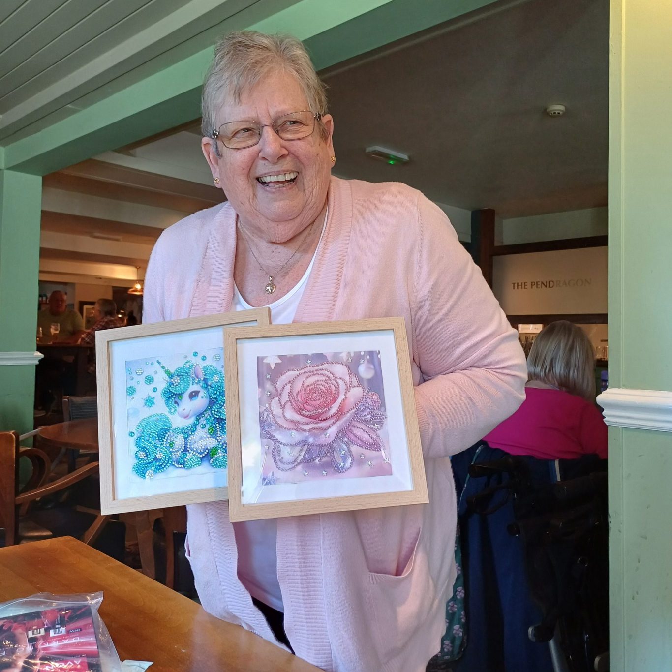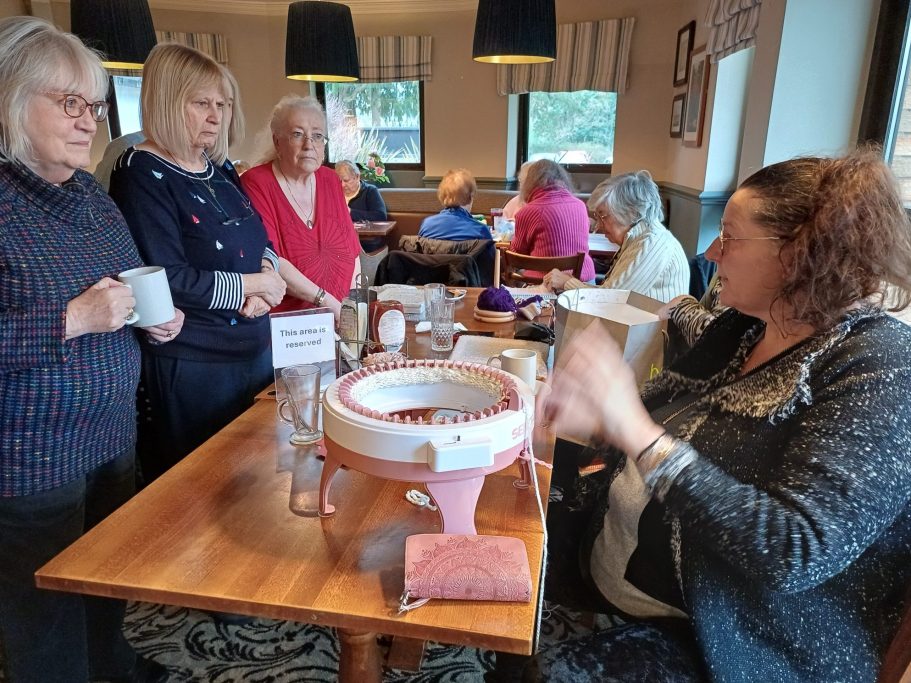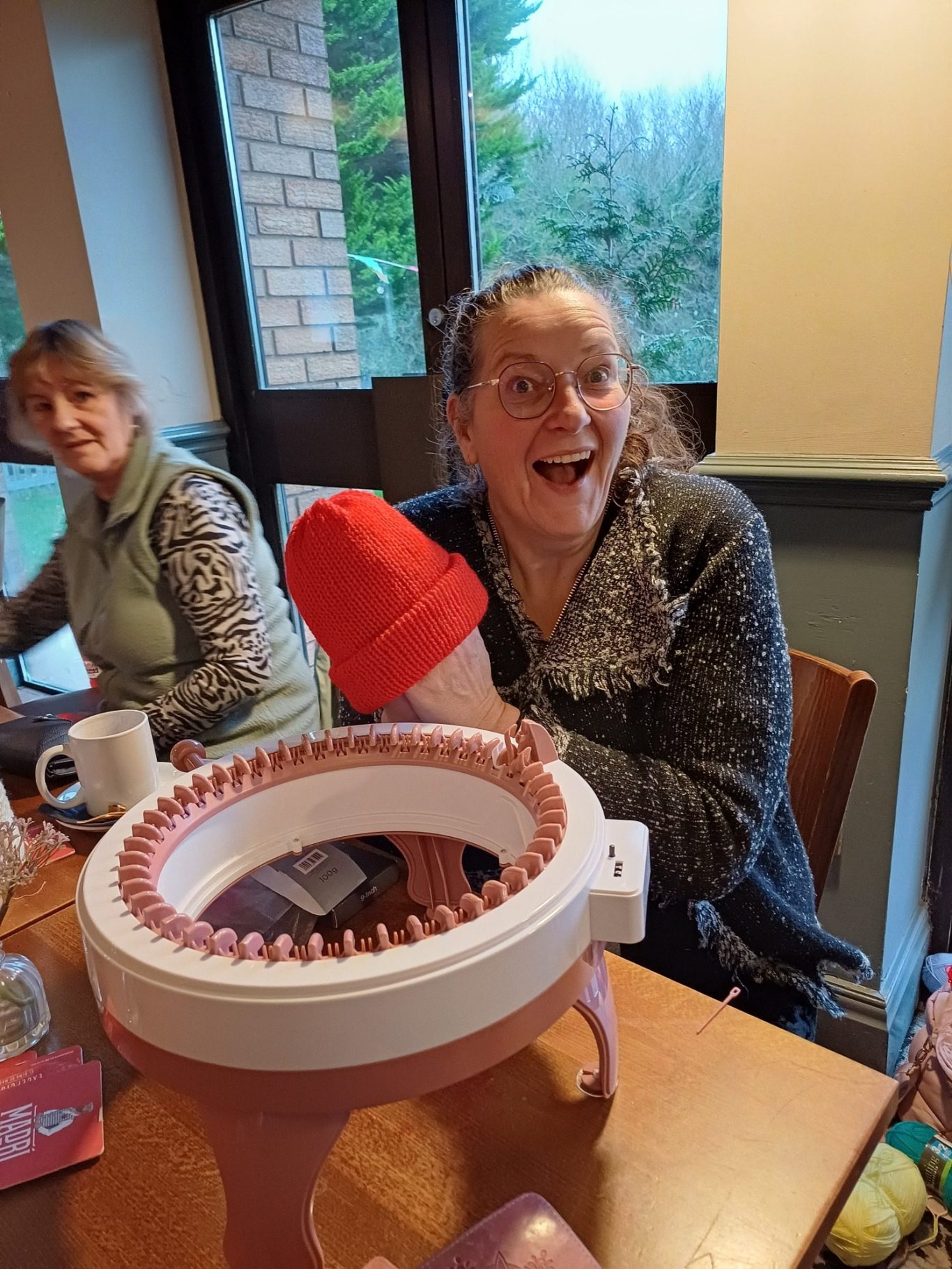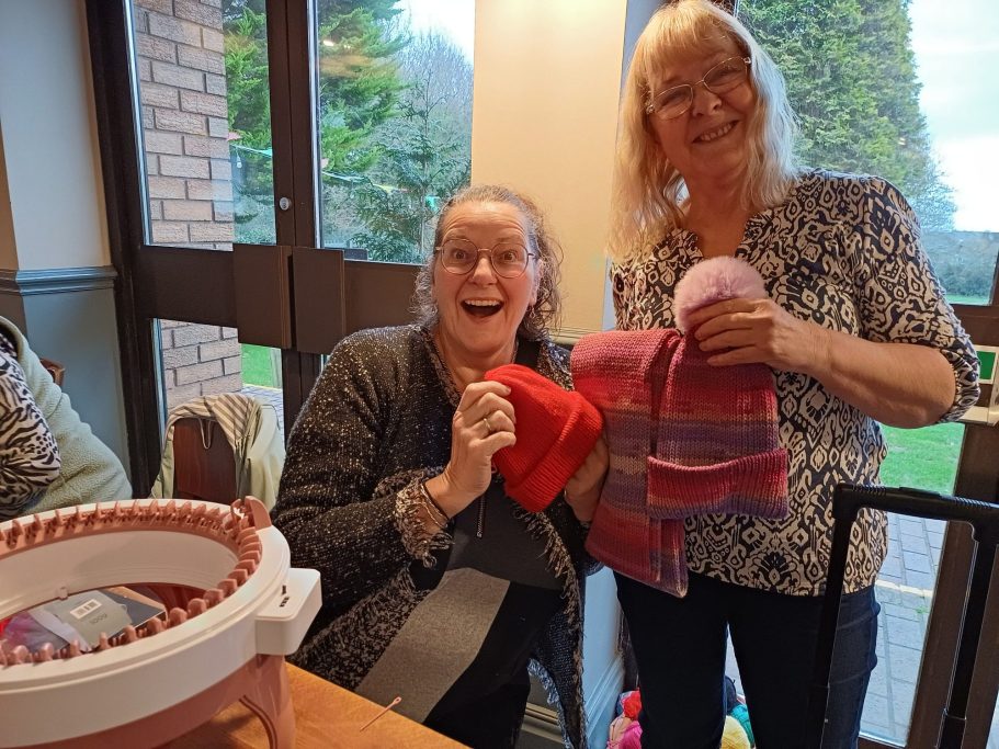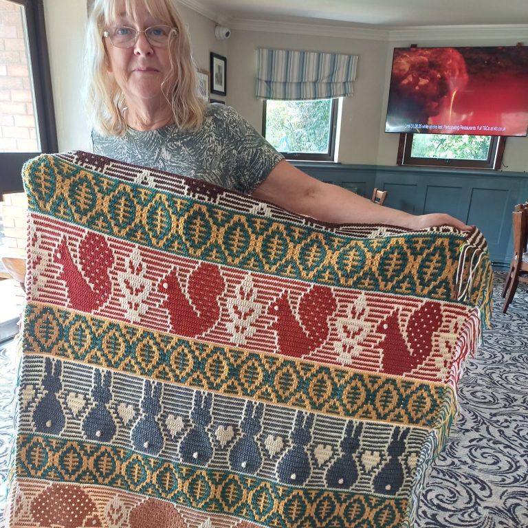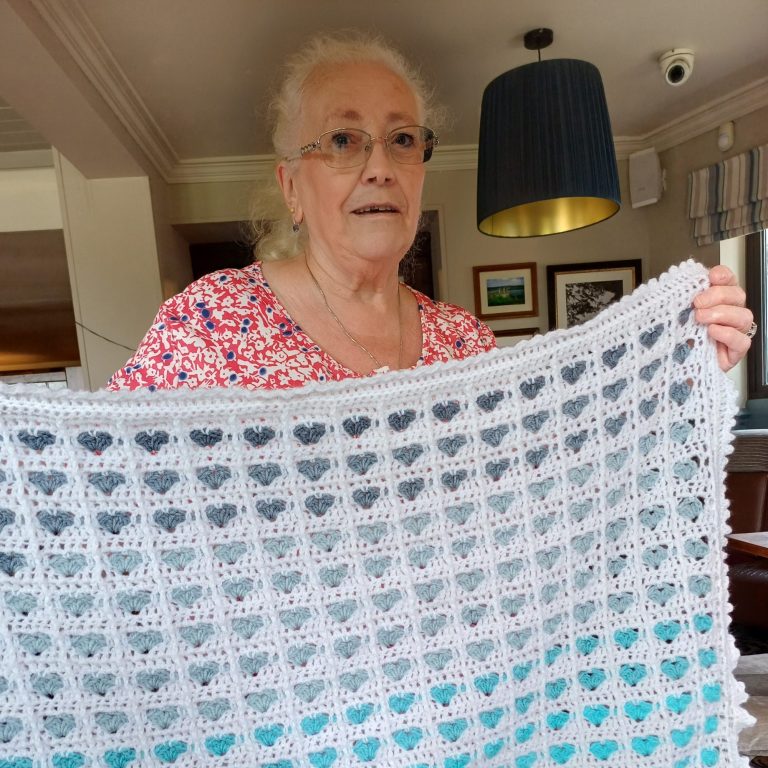 Hilary is demonstrating her expertly crocheted blanket with little hearts on it. She has made this for her grandson in America