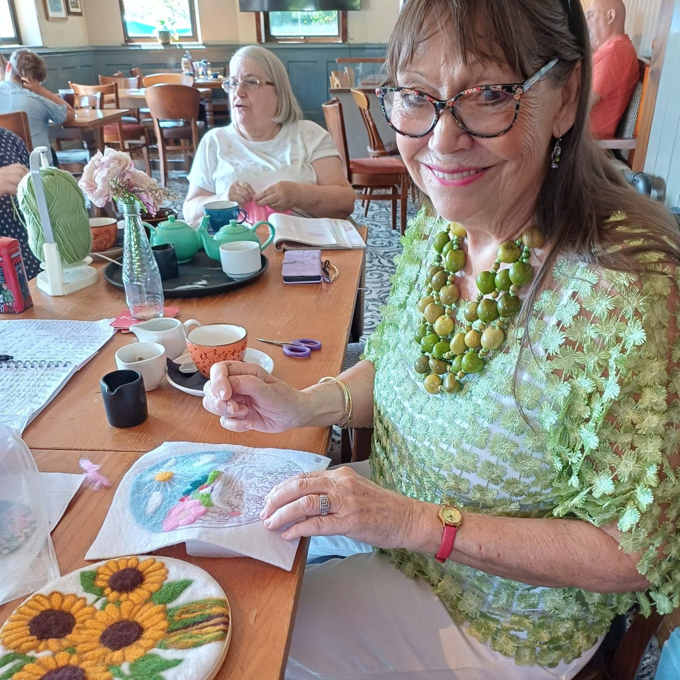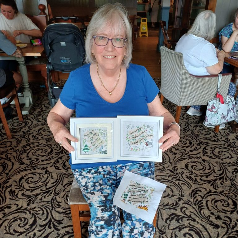 Angela is demonstrating her beautiful machine embroidery which she has framed.